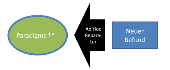 Während der normalwissenschaftlichen Phase sind Anomalien üblich und undramatisch. (S. 146f). In der Regel werden sie auf Unzulänglichkeiten des Wissenschaftlers zurückgeführt und durch Folgeexperimente versucht auszubügeln. Wenn das nicht gelingt, werde zunächst kleinere Ad-Hoc-Reparaturen vorgenommen, die Kernidee des Paradigmas bleibt dabei bestehen: