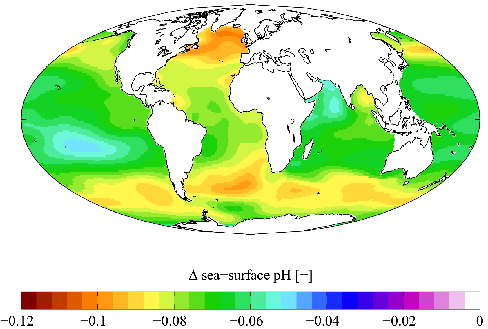 English: Estimated change in sea surface pH from the pre-industrial period (1700s) to the present day (1990s). Δ pH here is in standard pH units. This change is caused by the invasion of anthropogenic CO2 (see Ocean acidification). Calculated using Richard Zeebe's csys package with data from the Global Ocean Data Analysis Project[1][2] and World Ocean Atlas[3] climatologies. Δ pH is plotted here using a Mollweide projection (using MATLAB and the M_Map package).