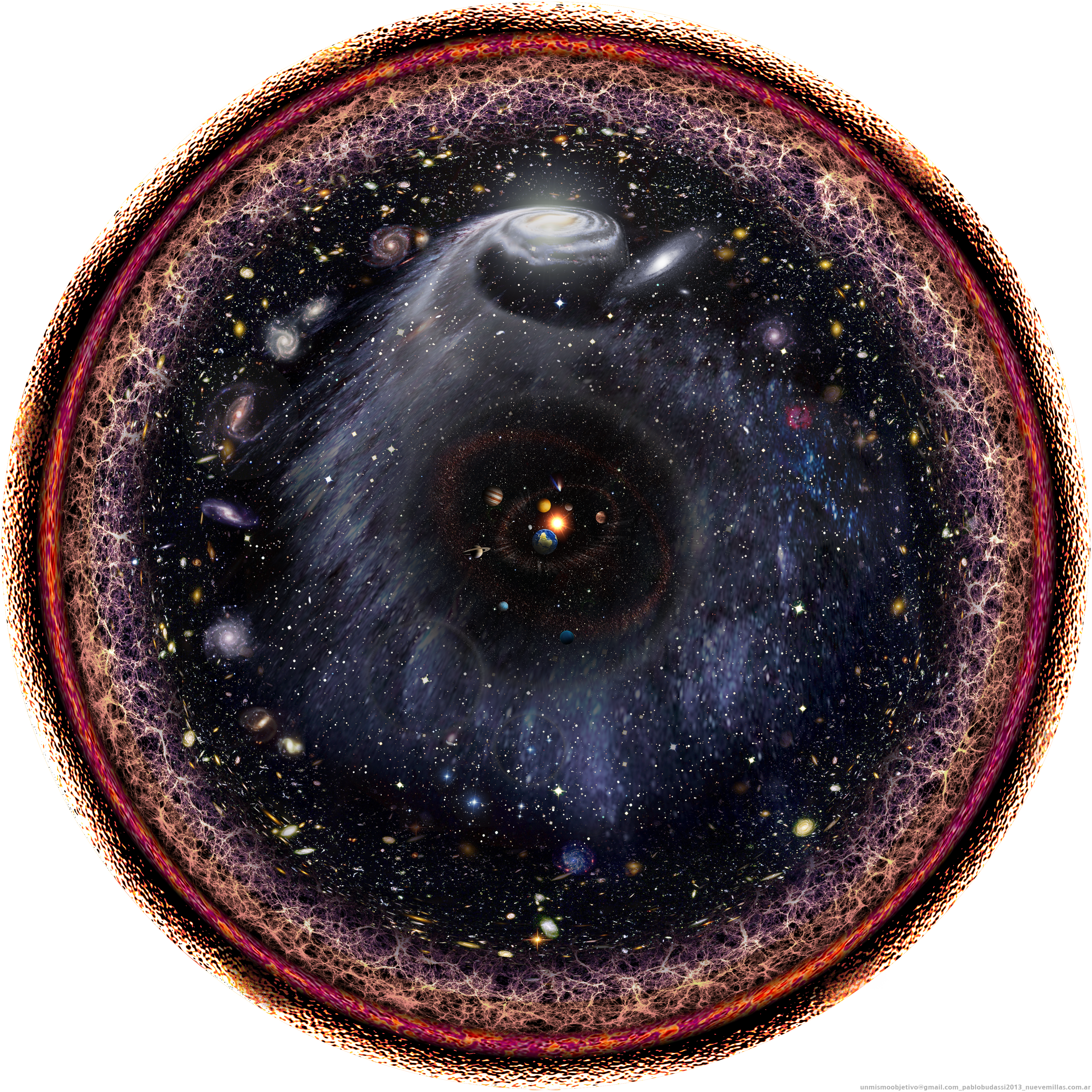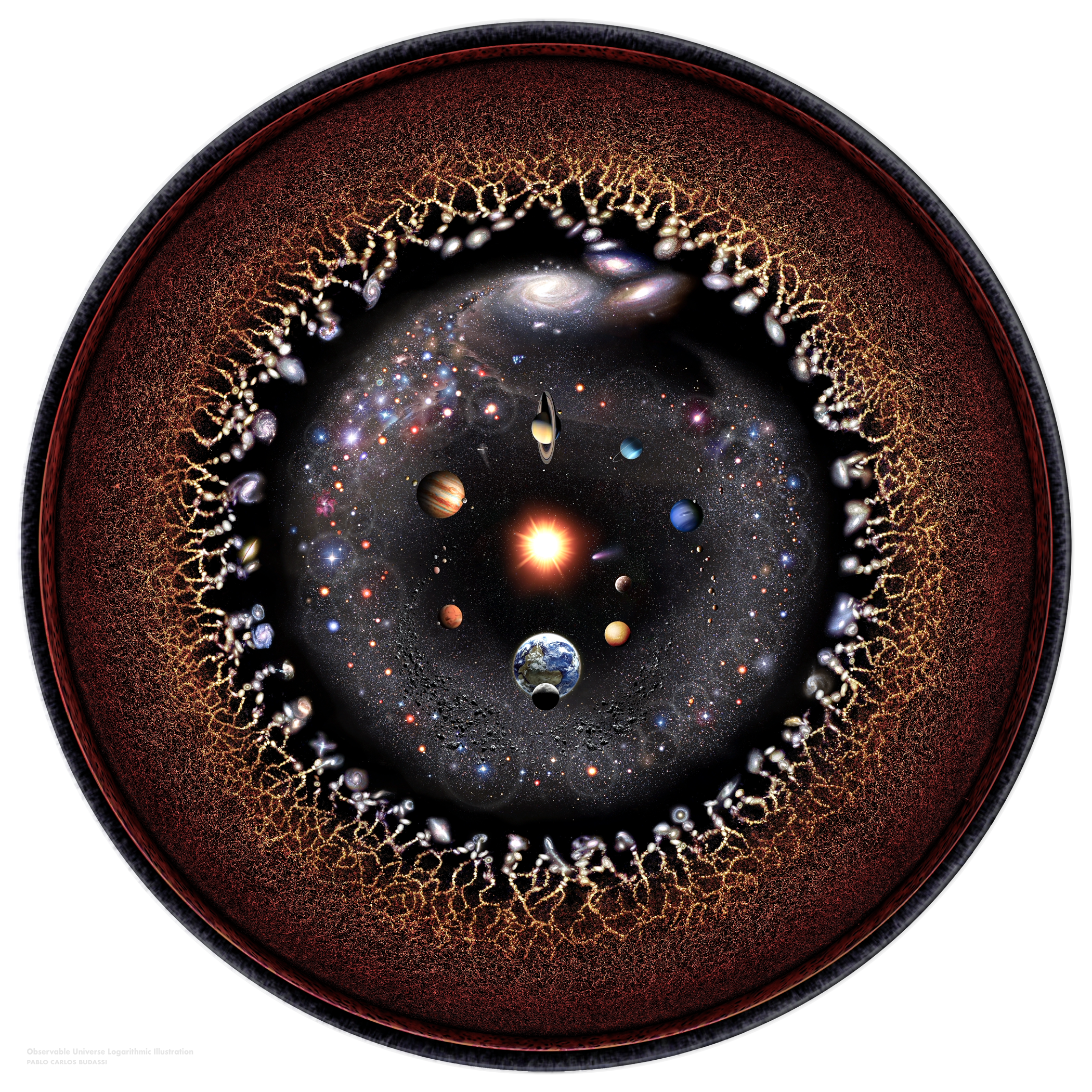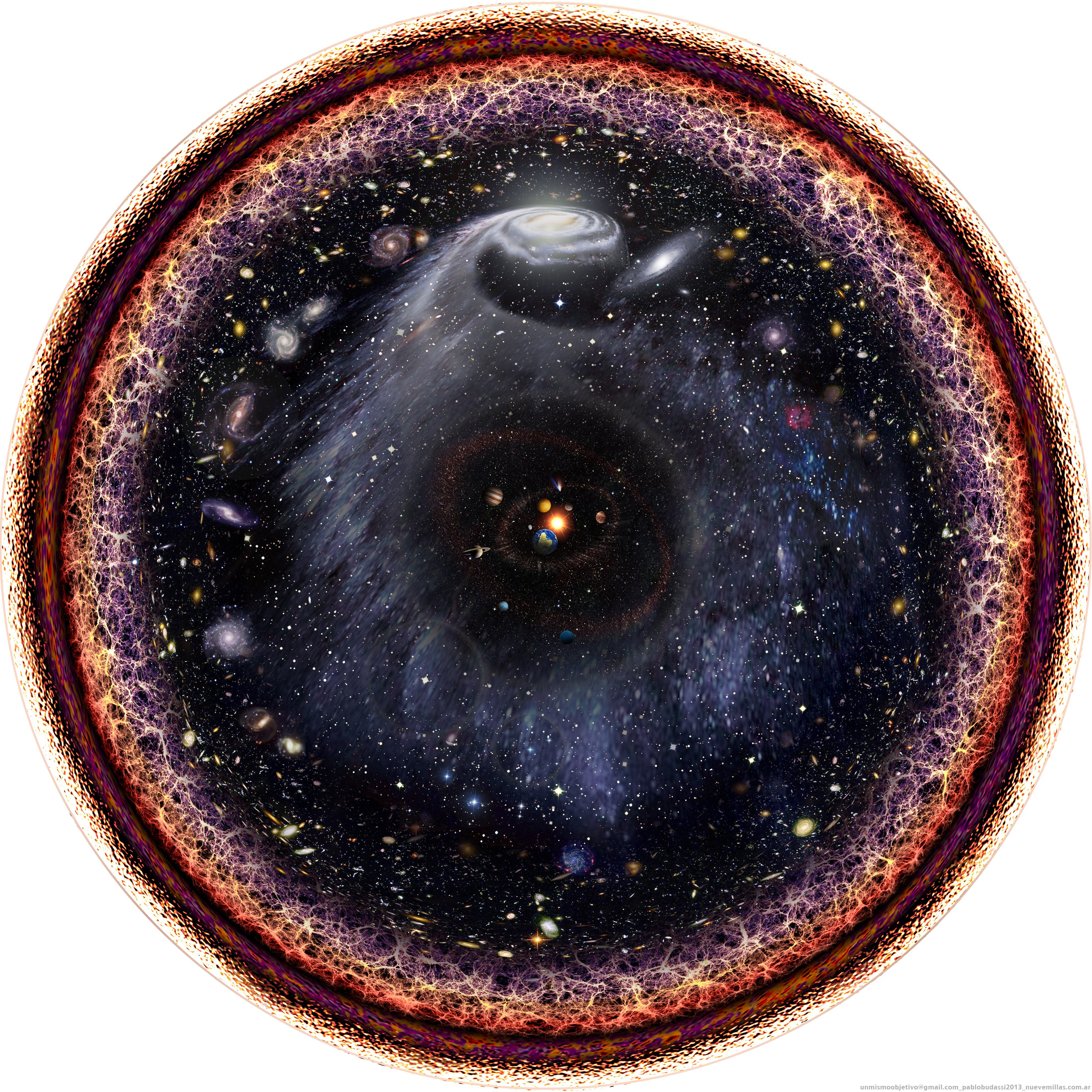 Русский: Художественное изображение Наблюдаемой Вселенной в логарифмическом масштабе. В центре Солнечная система, внутренние и внешние планеты, пояс Койпера, облако Оорта, Альфа Центавра, рукав Персея, галактика Млечный Путь, галактика Андромеды, соседние и дальние галактики, крупномасштабная структура Вселенной и реликтовое излучение. По краю изображена невидимая плазма Большого взрыва.