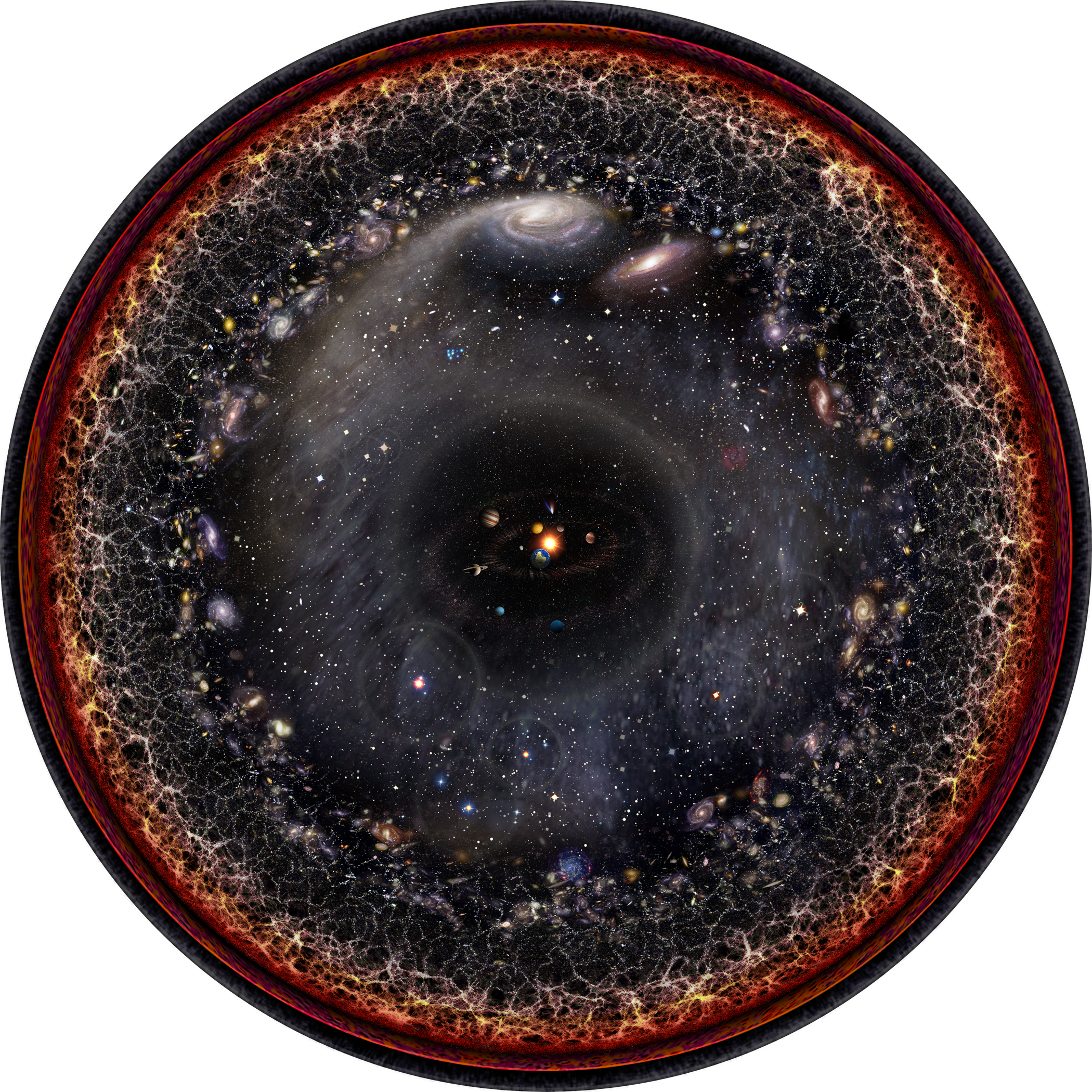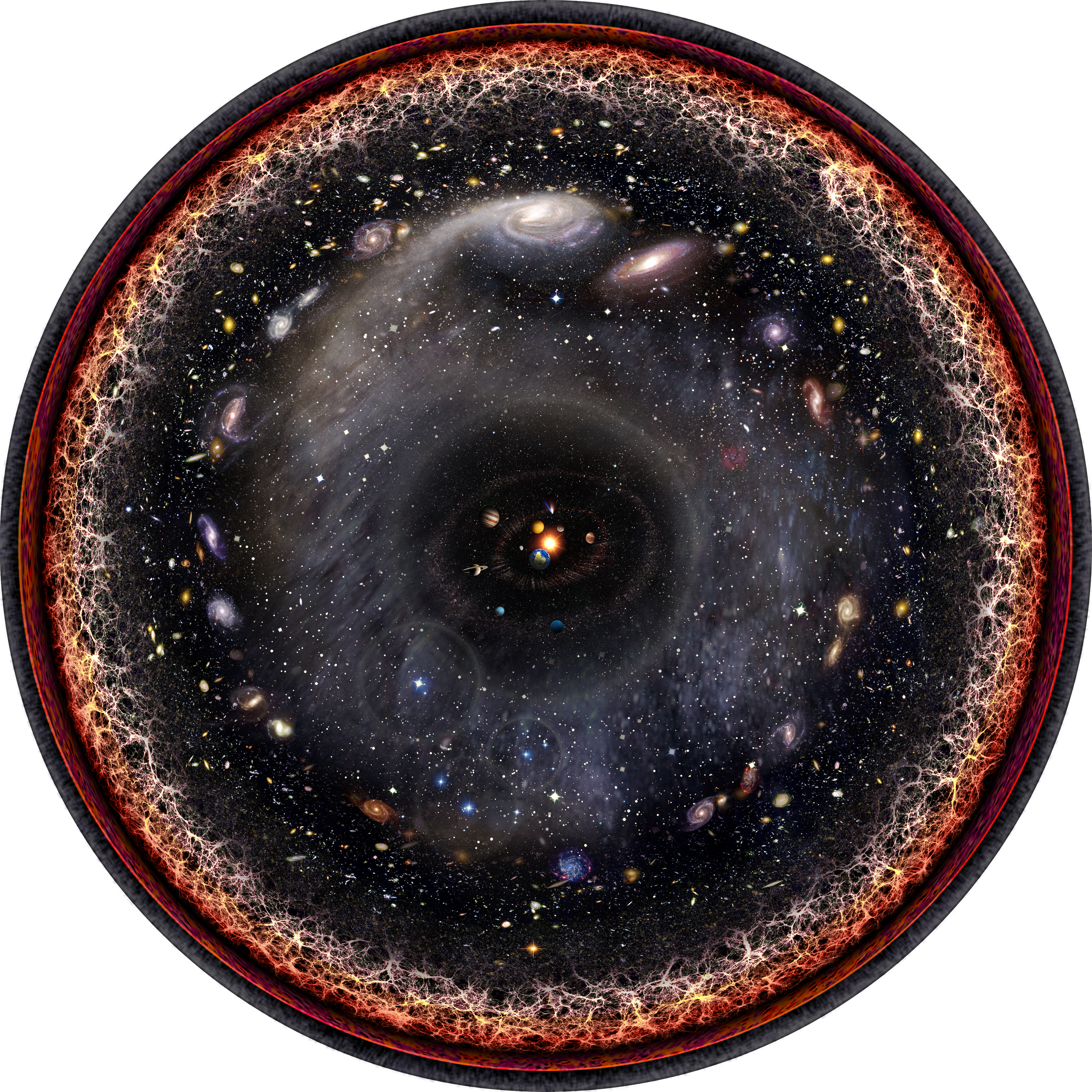 Suomi: Logaritmisessa mittakaavassa oleva taiteilijan näkemys havaittavasta maailmankaikkeudesta; alkaen keskeltä Aurinkokunta, sisemmät ja ulommat planeetat, Kuiperin vyöhyke, Oortin pilvi, Alfa Centauri, Perseuksen kierteishaara, Linnunradan galaksi, Andromedan galaksi, lähimmät galaksit, Cosmic Web, kosminen taustasäteily ja reunalla alkuräjähdyksen näkymätön plasma.