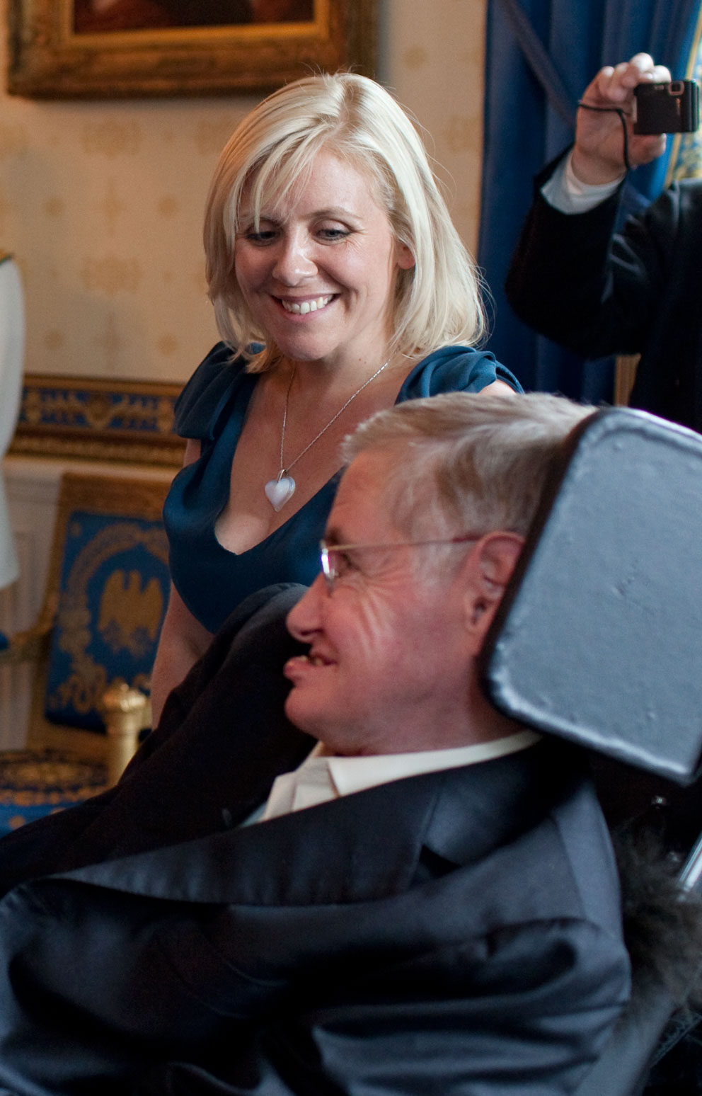 English: Dr. Stephen Hawking with his daughter Lucy Hawking in the Blue Room of the White House before a ceremony presenting him and 15 others the Presidential Medal of Freedom on 12 August 2009. The Medal of Freedom is America's highest civilian honor. |
