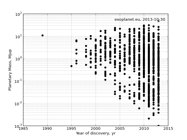 | 00:03, 16. Nov. 2012 | 640 × 480 (40 KB) | MichaelSchoenitzer | {{Information |Description=The mass of exoplanets over the year of discovery. Excluded are exoplanets wich discovery is discussed controversial and exoplanets in pulsar systems. |Source= [http://exoplanet.eu/diagrams/?t=s&f=detection+!%3D+%22pulsar%22+... |