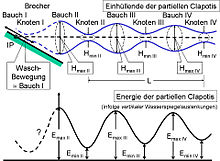 Werden die genannten Energieanteile , , jeweils in das Verhältnis zur Energie der anlaufenden Wellen gesetzt, können solche Werte als Transmissionskoeffizient, Reflexionskoeffizient und Absorptionskoeffizient angegeben werden. Im Allgemeinen ist der Reflexionskoeffizient . Nur im theoretischen Fall der perfekten Reflexion (bei Vorliegen einer perfekten Clapotis) ist . Nur hierfür gilt auch die Aussage, dass bei der Reflexion an einer ideal glatten vertikalen Wand ein Phasensprung nicht auftritt. Insbesondere bei partieller Reflexion an steilen, ebenen Uferböschungen kann der Phasensprung etwa 180° betragen, vergl. nebenstehendes Bild.