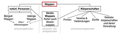 Wappen, die von natürlichen Personen geführt werden, können weiter nach dem Stand des Trägers in Adelswappen und bürgerliche Wappen unterschieden werden.