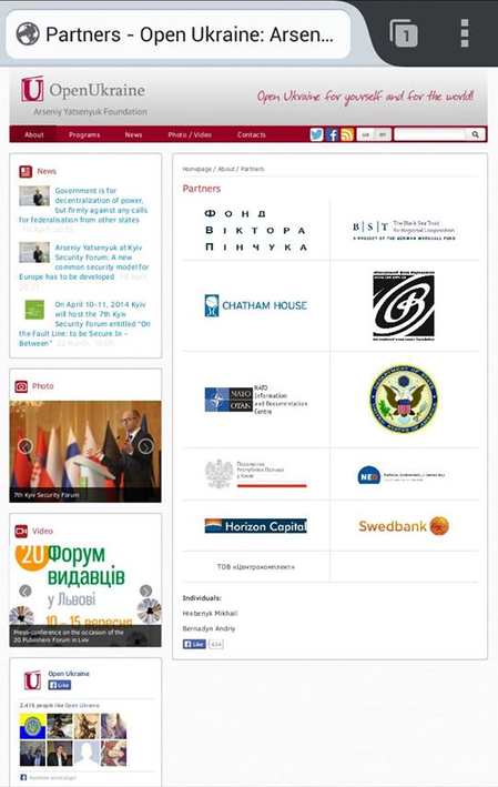 Der im Gegensatz zur Übergangsregierung unter Jazenjuk unter einer demokratischen Wahl entschiedene Anschluss der Krim an Russland steht im öffentlichen Fokus. Kaum ein Politiker oder Journalist frägt wer warum und wozu nun eigentlich die illegale Regierung stellt. In diesem Zusammenhang bin ich auf eine ungemein interessante Geschichte gestoßen. Der amtierende Ministerpräsident der Ukraine ist Arsenij Jazenjuk. Bereits aus den abgehörten Telefonat Nulands ging hervor, dass die Amis diesen gerne als Ministerpräsidenten sehen würden. Jazenjuk hat die Stiftung „Open Ukraine Foundation“ gegründet. Unter ihre Unterstützer fallen die NATO, das amerikanische Außenministerium und weitere interessante Mächte, wie folgender Screenshot belegt. Ich denke dies ist ein weiteres Indiz dafür, dass westliche Nationen hinter dem Putsch stehen könnten.