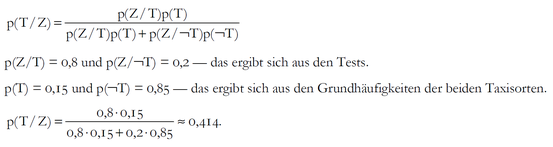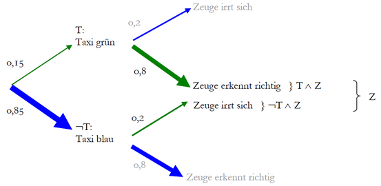 Beispiel: In einer Stadt fahren 100 Taxis, 85 blaue und 15 grüne. Ein Zeuge hat einen Unfall beobachtet, in den ein Taxi verwickelt war. Er sagt, das Taxi sei grün gewesen. Tests ergaben, dass dieser Zeuge unter den gegebenen Sichtverhältnissen jede der beiden Farben in 80% der Fälle richtig identifizierte, und in nur 20% der Fälle mit der jeweils anderen Farbe verwechselte.