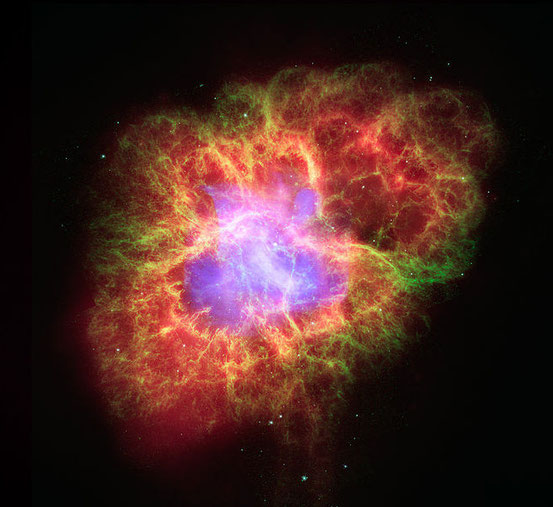 Eine Supernova (lat. „stella nova“ für „neuer Stern“) ist das eruptive, ausgesprochen helle Aufleuchten eines endeten Sterns. Nicht alle Sterne gehen am Ende ihrer Lebensdauer in einer Supernova auf: Es sind bevorzugt die massereichen Sterne mit einer Masse von 2,3 bis 3 Sonnenmassen, die sich mit dem ansehnlichen Feuerwerk einer Supernova verabschieden.