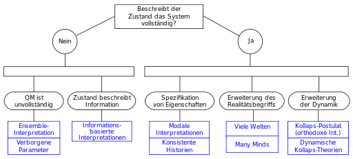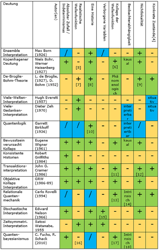 [3] Die in den Zellen der Tabelle gezeigten Werte sind nicht unumstritten, denn die genauen Bedeutungen einiger der beteiligten Konzepte sind unklar und stehen selbst im Mittelpunkt der Kontroverse eine Interpretation. Für eine andere Tabelle, die Interpretationen der Quantentheorie vergleicht, siehe: Lombardi, Olimpia,, Fortin, Sebastian, 1979-, Holik, Federico,, López, Cristian,: What is quantum information?, ISBN 9781107142114, OCLC 965759965.